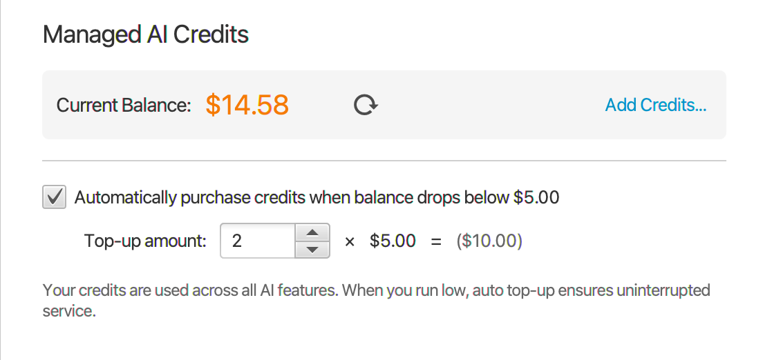 You may purchase additional AI-usage credits as one-time purchases or enable optional automatic top-ups directly in Tag under Account → AI Credits (Managed Plan Only). Automatic top-ups will be charged to the credit card on file and provide peace of mind about continuity of service. You may cancel automatic top-ups at any time.